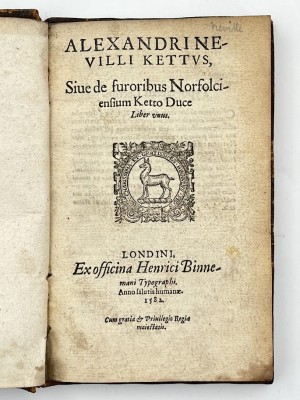 KETT’S REBELLION - PRESENTED TO ELY CATHEDRAL LIBRARY BY BISHOP SYMON: Alexandrinevilli Kettus, Sive de furoribus Norfolciensium Ketto Duce : Liber unus