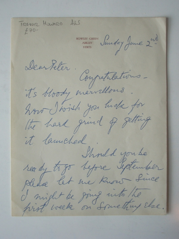[1 ALS] A manuscript letter from English actor Trevor Howard to film director Peter Duffell, congratulating him on a new venture "It's bloody mar… Read more
