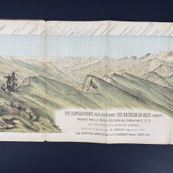 Alpine panorama made up of 24 folding segments (24x15cm) with a lithographed (Ch. Serex) image of the mountains on one side and steel engraved ad… Read more