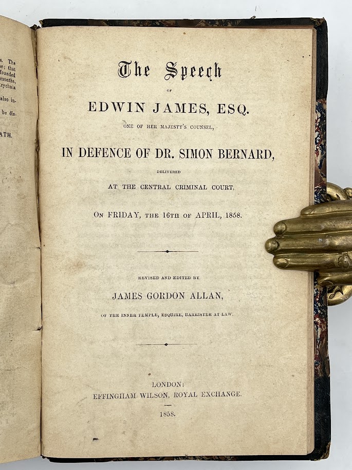 5 Edwin James, The Speech of Edwin James Esq, one of Her Majesty’s Counsel, in Defence of Dr Simon Bernard, Delivered at the Central Criminal Cout on Friday the 16th of April, 1858. Revised and edited by James Gordon Allan’. Original pamphlet published by Effingham Wilson, London, 1858. 30 pp. In very good condition.