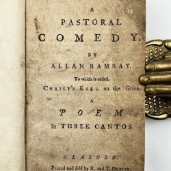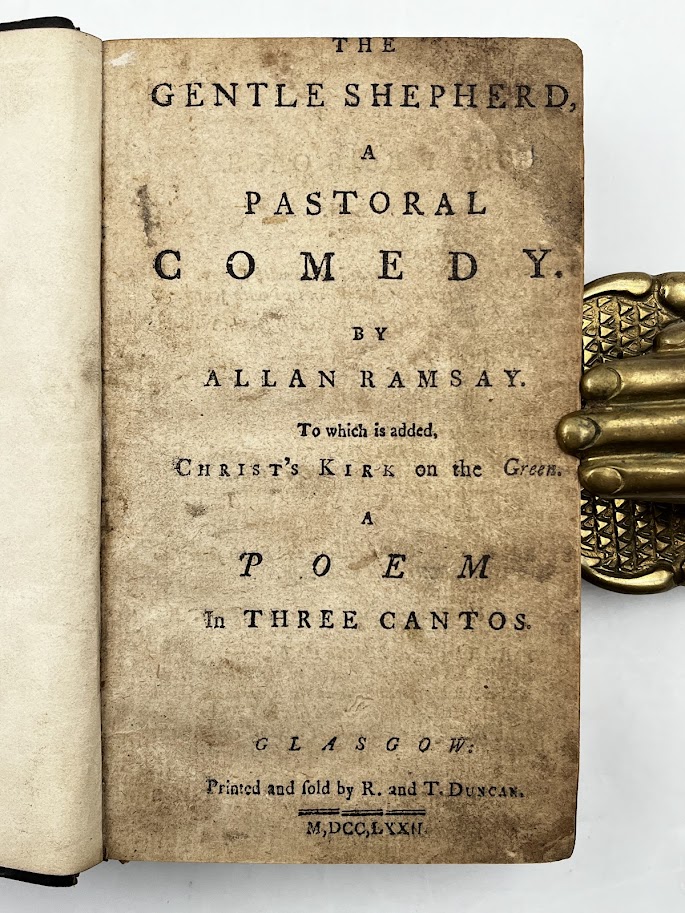 1772 edition published in Glasgow of The Gentle Shepherd, A Pastoral Comedy by Allan Ramsay To which is added Christ’s Kirk on the Green, A Poem in Three Cantos. Printed and folded by R and T Duncan. 83 pp. collated and complete. In very good condition. Age toned as expected particularly to title page. Remaining text block crisp and legible.