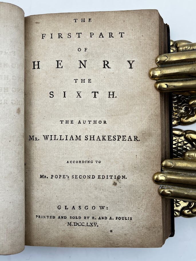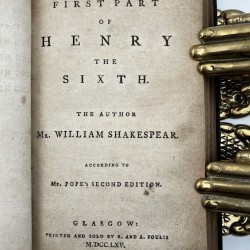4 plays taken from the 1776 edition published in Glasgow of Volume 5 of Works of Shakespear in Eight Volumes Collated and Corrected by the Former Editions, by Mr Pope printed from his Second Edition. In good condition throughout. Age toned as expected. A few ink spots to rear leaves which do not compromise the text. Printed by Robert and Andrew Foulis including: