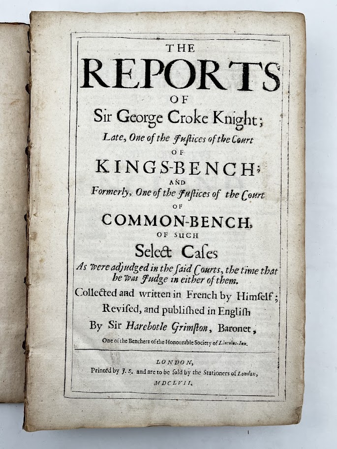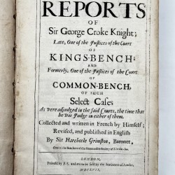 THE REPORTS OF SIR GEORGE CROKE KNIGHT; LATE, ONE OF THE JUSTICES OF COURT OF KINGSBENCH; AND FORMERLY, ONE OF THE JUSTICES OF THE COURT OF COMMON BENCH OF SUCH SELECT CASES AS WERE ADJUDGED IN THE SAID COURTS, THE TIME THAT HE WAS JUDGE IN EITHER OF THEM