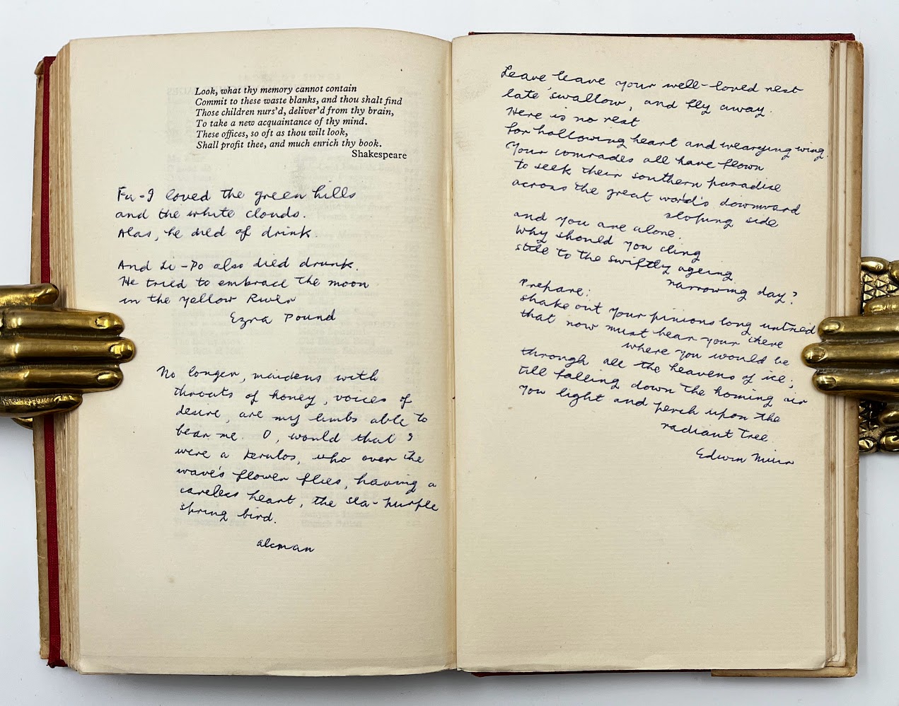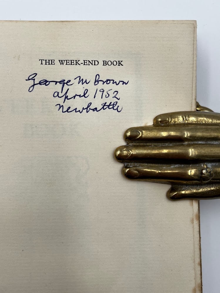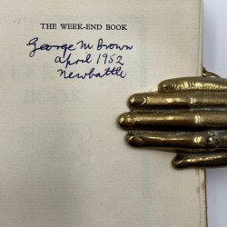 George Mackay Brown’s copy, inscribed by him in blue ink to the half title page: “George M Brown / April 1952 / Newbattle”. One of the leading Scottish poets of the twentieth century, Brown has annotated the book towards the rear, adding three manuscript poems in blue ink. The first of these is ‘Epitaphs’ by Ezra Pound, the second a fragment from the ancient Greek poet Alcman, and the third ‘The Late Swallow’ by fellow-Orcadian poet Edwin Muir, who had been a great influence on Brown. Pleasingly, it was at Newbattle Abbey College during the 1951-52 session (during which Brown inscribed and annotated the present book), that he first encountered Muir, who served there as warden between 1950-55. The pair subsequently became friends, with Muir supporting Brown’s endeavours, most notably providing the foreword to Brown’s first anthology ‘The Storm’ (1954), of which he remarked: “Grace is what I find in these poems.”