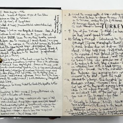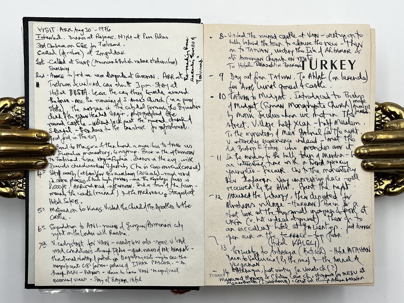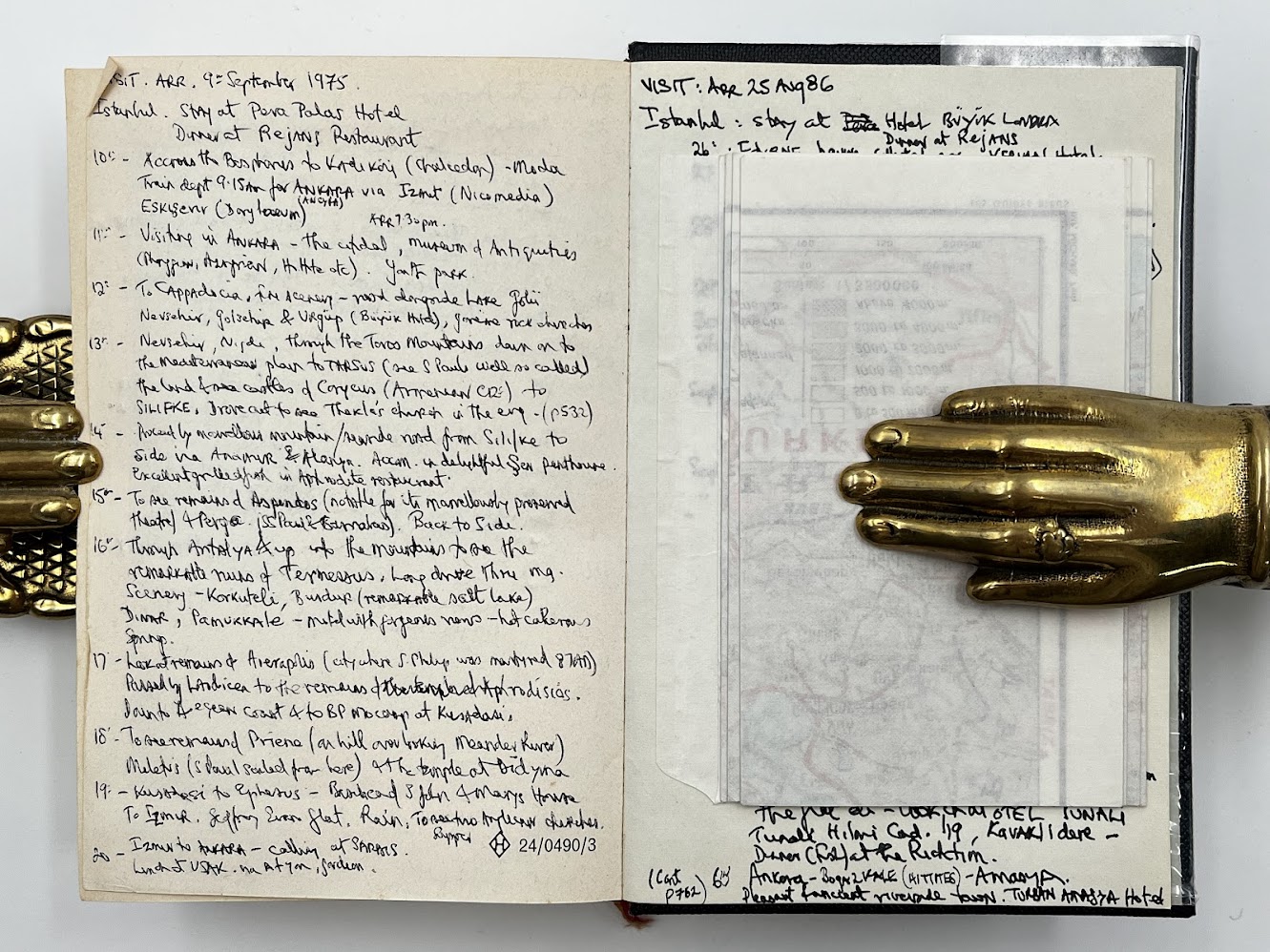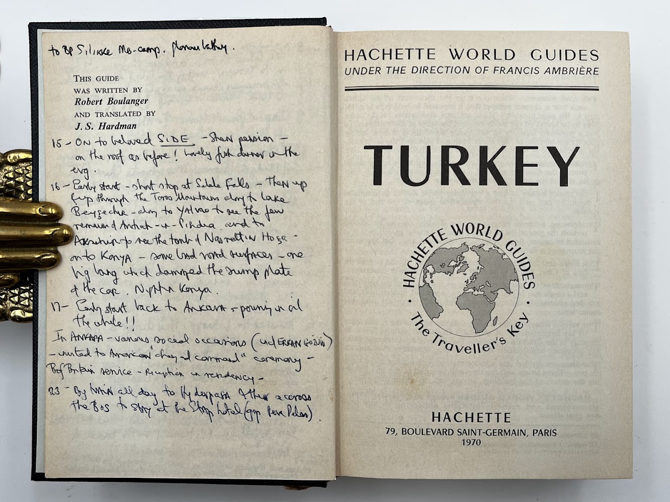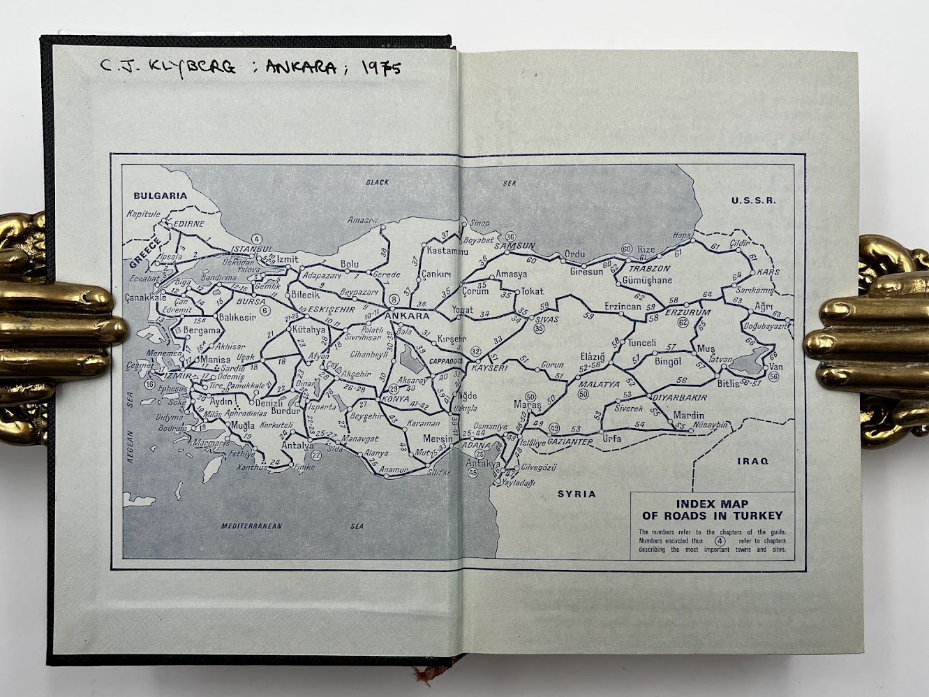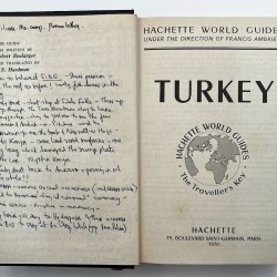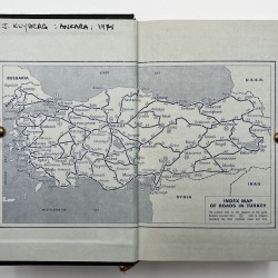 Inscribed “C. J. Klyberg: Ankara; 1975” to the front pastedown, and subsequently annotated with the detailed itinerary of three separate trips to Turkey in 1975, 1976, and 1986, densely written in black and blue ink across the front and rear endpapers, the half title page, and pp.759 and 762 (eight sides in total). Two further single-word annotations updating/correcting the text to pp.615-616. Manuscript list providing a translation of the months of the year from Turkish to English loosely laid in. The owner of the present copy, Charles John Klyberg (1931-2020), was the former Anglican Bishop of Fulham (1985-1996), who later converted to Catholicism. He uses the guidebook to record a personal day-by-day diary documenting his wide-ranging travels and experiences during his various trips to Turkey, with a particular emphasis on visits to historical and religious sites and social engagements. A typical entry reads: “2nd Sept. 1976: Arr. at Trabzon & unload the car about 3pm. Stay at Hotel Bista. Leave the car there & walk around the town – see the remains of S. Anne’s Church (in a poor state), the mosque in the citadel formerly of the Byzantine Church of the Gilded Virgin, photographed the ruined castle – walked back past the ruined Church of S. Basil – then down to the seashore for refreshments. Good food in the eve.” In the course of his narratives, Klyberg documents visits to American and British radar stations, as well as numerous churches and mosques, a meeting with the consul general, journeys down the Bosphorus, and several scenic road trips.