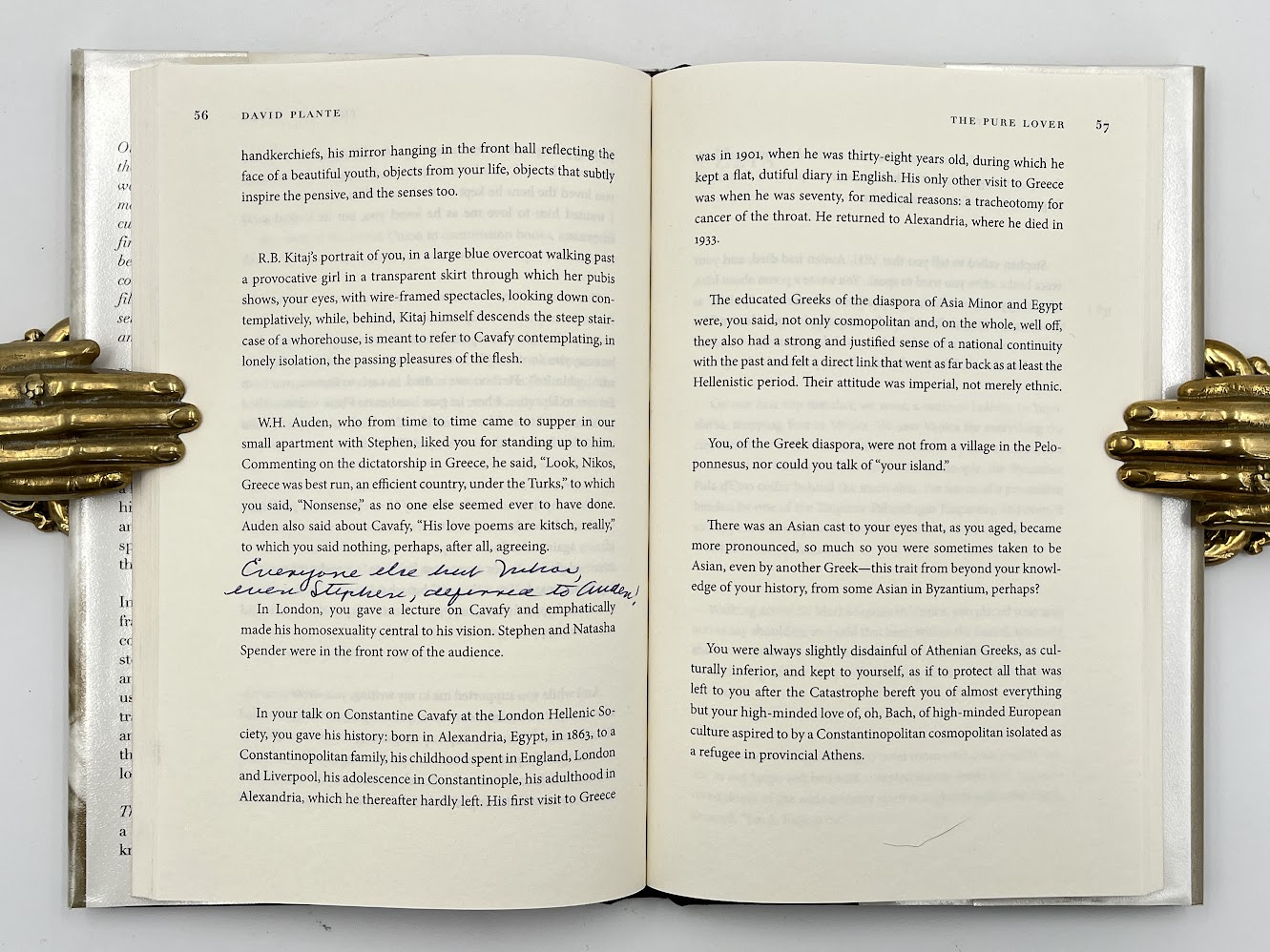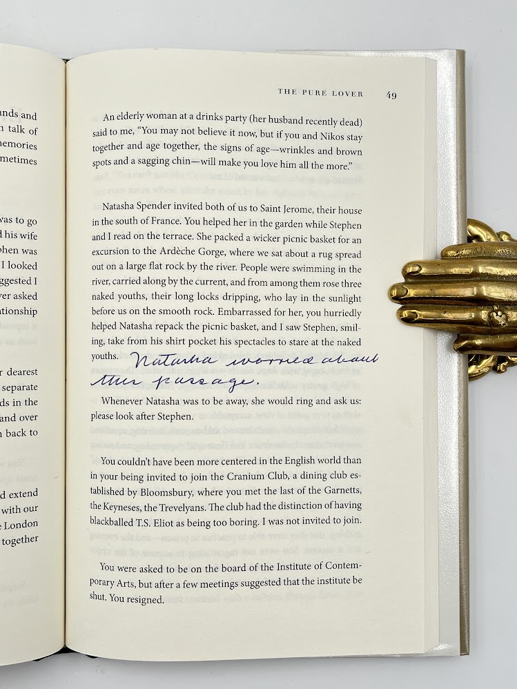 The author has also annotated 20 text pages in blue ink, with verbal notations augmenting the printed text with additional details. For example, where in the text Plante states that “Stephen Spender visited us secretly in Italy” where “he took photographs of us in an olive grove”, he adds in manuscript alongside “I have these photographs”. Elsewhere, regarding his partner’s no-nonsense approach in debates with W. H. Auden, he adds “Everyone else but Nikos, even Stephen [Spender], deferred to Auden”. Plante also further probes the content of his work, jotting a questioning note – “is this possible?” – next to his printed assertion that “grief demands a grand, timeless expression”. Some of the notes are particularly touching, particularly one describing Plante’s dreams of his partner following his death. The recipient of the present work was possibly the author’s friend, the British literary critic Frank Kermode (1919-2010), who spent his final years in Cambridge.