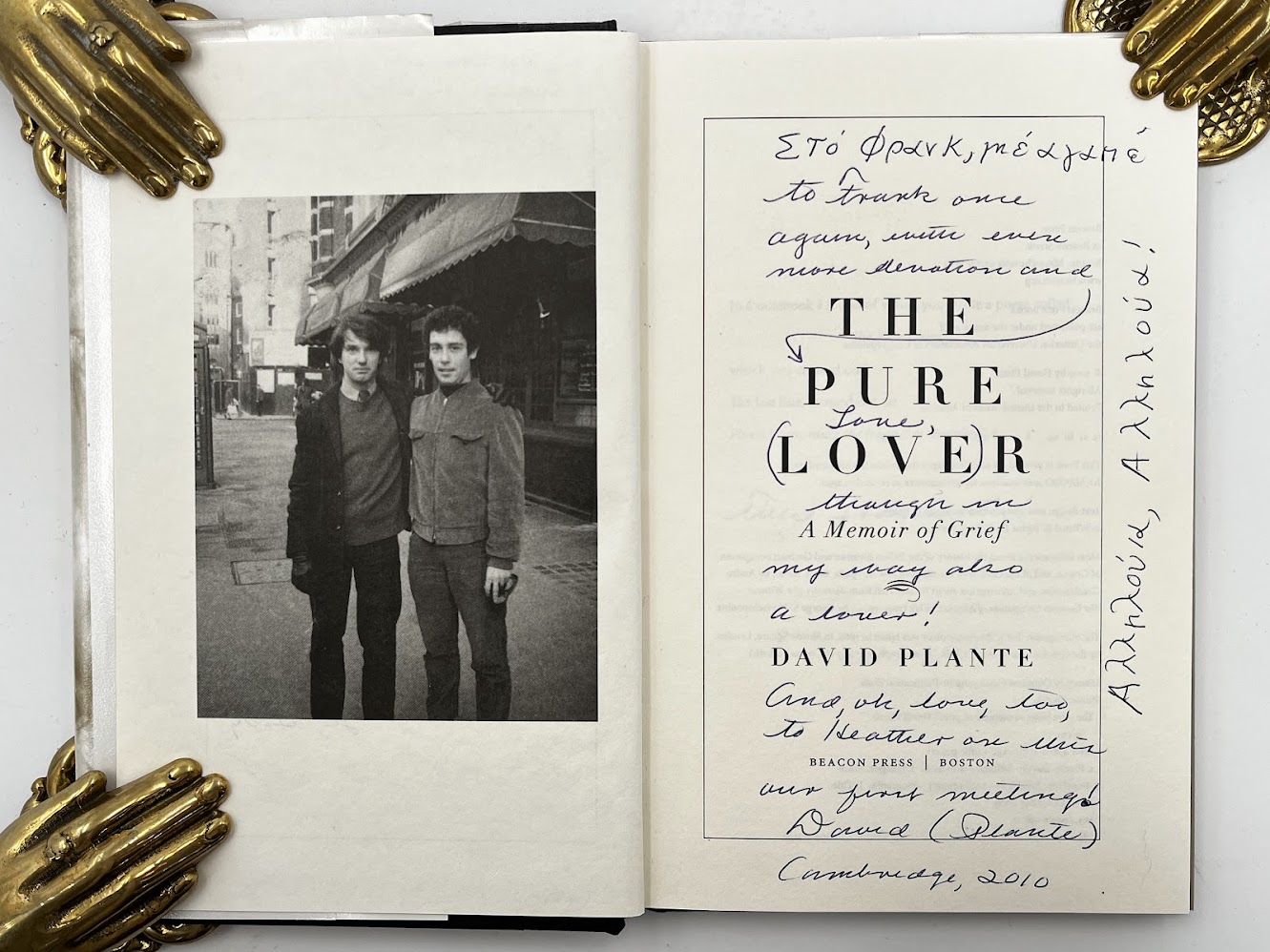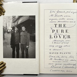 First edition, signed, inscribed with teasingly private annotations intended for the book’s recipient alone. Plante has written on the half title “To Frank / with countless / years of devotion / and love! / David / Cambridge, 2009”, and again in blue ink to the title page: “To Frank once / again, with even / more devotion and / love, / though we / may[?] say[?] also / a lover! / and, ok, love, too, / to Heather and Muir / our first meeting! / David (Plante) / Cambridge, 2010”, along with several words in Greek.