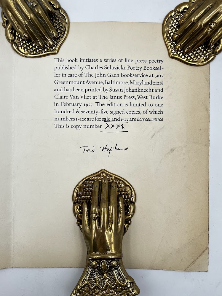 A limited edition, limitation statement signed by Ted Hughes which originally accompanied a Charles Seluzicki, 1975 edition of Chiasmadon. The st… Read more