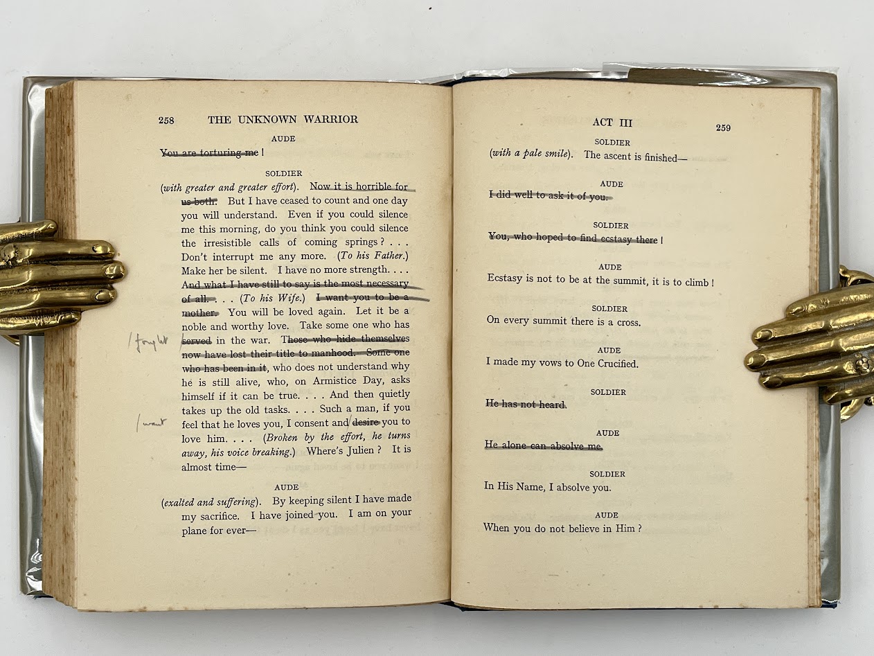 Anti-war play inscribed by the British fighter ace, author, founding executive of the BBC, and translator of the present work Cecil Lewis (1898-1997) to the playwright, author, and producer Lawrence Langer (1890-1962). In black ink on the front free endpaper: “For / Lawrence Langner / 12.1.30 / Cecil Lewis”. Langer has subsequently annotated the book in pencil to virtually every text page, preparing it for a stage adaptation. These extensive annotations mostly consist of deletions, with large sections of dialogue crossed through and a significant number of new words and part-sentences added in manuscript. These alterations certainly appear quite brutal (perhaps a comment on Lewis’s translation!), although, arguably, the text does feel less cumbersome and the dialogue flows more naturally as a result.