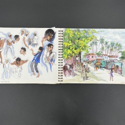 PHYSICAL DESCRIPTION: Soft back landscape sketchbook measuring approx. 7” x 10”. Contains c35 pp. full page colour sketches, many forming part of a double page landscape alongside c10 pp. leaves full of marvellous vignettes and sketches which capture the essence of the people and characters along the way. A couple of leaves detached. Watercolour and pen. All in very good condition.
