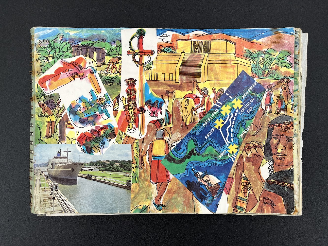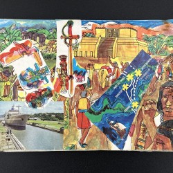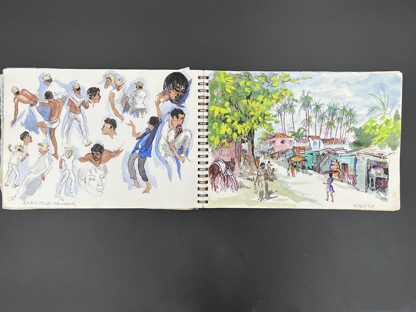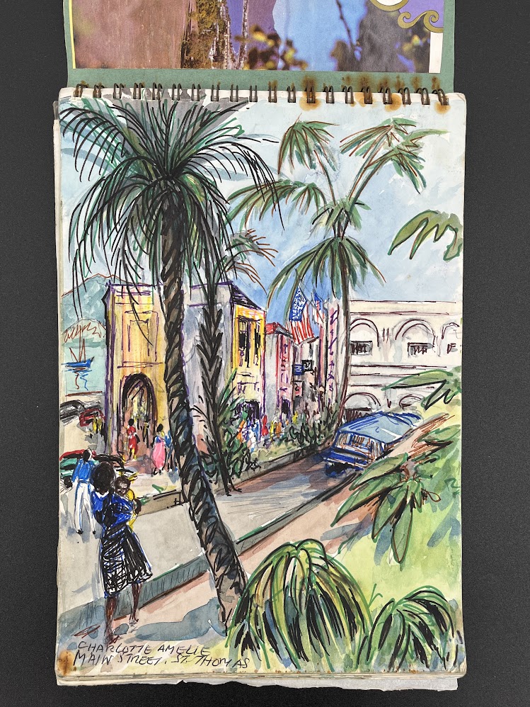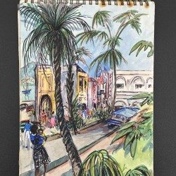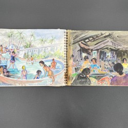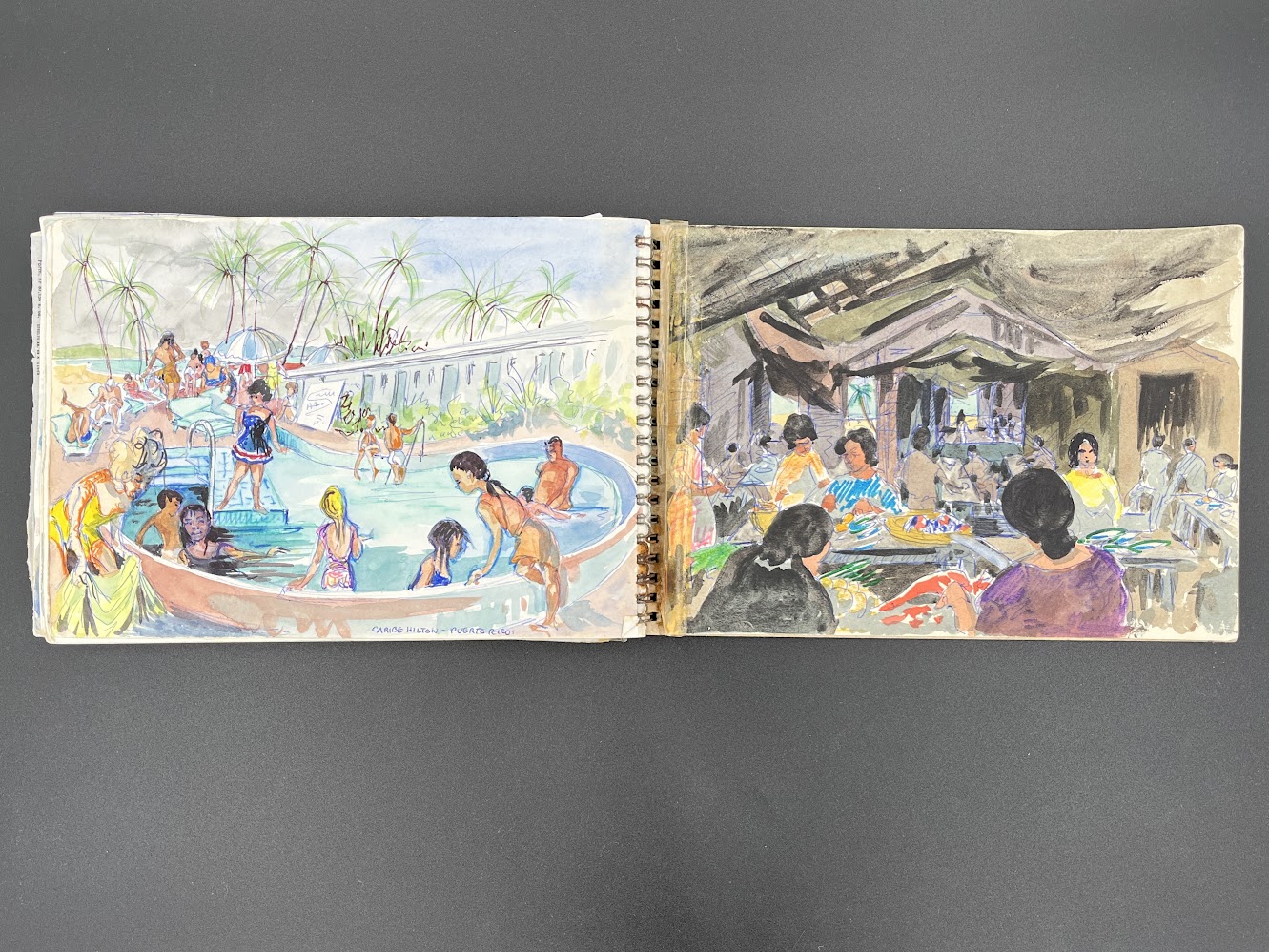Sketch book crammed with full page, double page and smaller vignettes of daily life captured throughout the artist’s travels in Central America, the locations sketched and painted include: Main Street, St Thomas in the Virgin Islands, Puerto Cabello in Venezuela, Puntarenas in Costa Rica (5 pp. coastal scenes), Acajutla in El Salvador, Mazatlan, Le Union in El Salvador, Guaymas in Mexico (a cotton yard. the wharf), Volcanoes in San Jose, Guatetmala, Corinto in Nicaragua (beach scenes), siesta time and birds in Corinto, Saint Juan del Sud Nicaragua, the dawn flight of the ibis in Puerto Cabello, Venezuela, Fort Geronimo, San Juan in Puerto Rico and pool scenes c1965 at the Caribe Hilton in Puerto Rico.