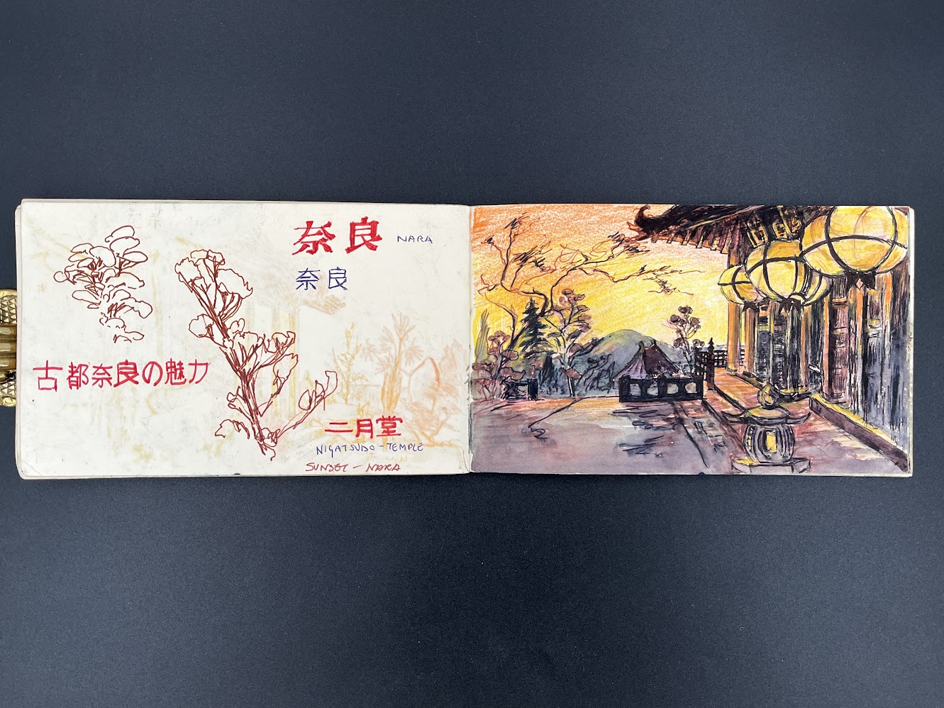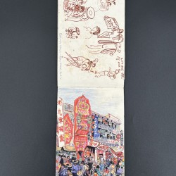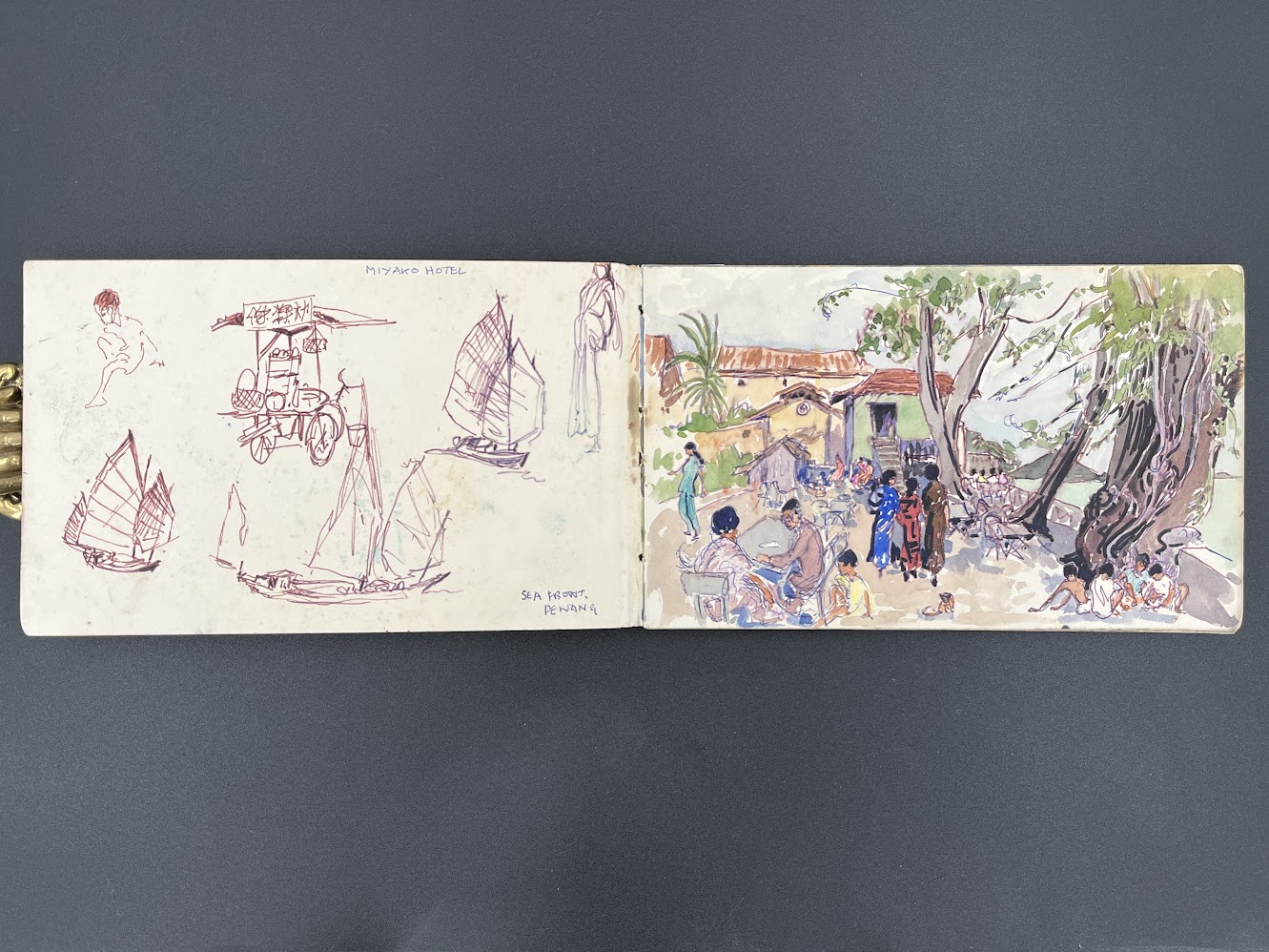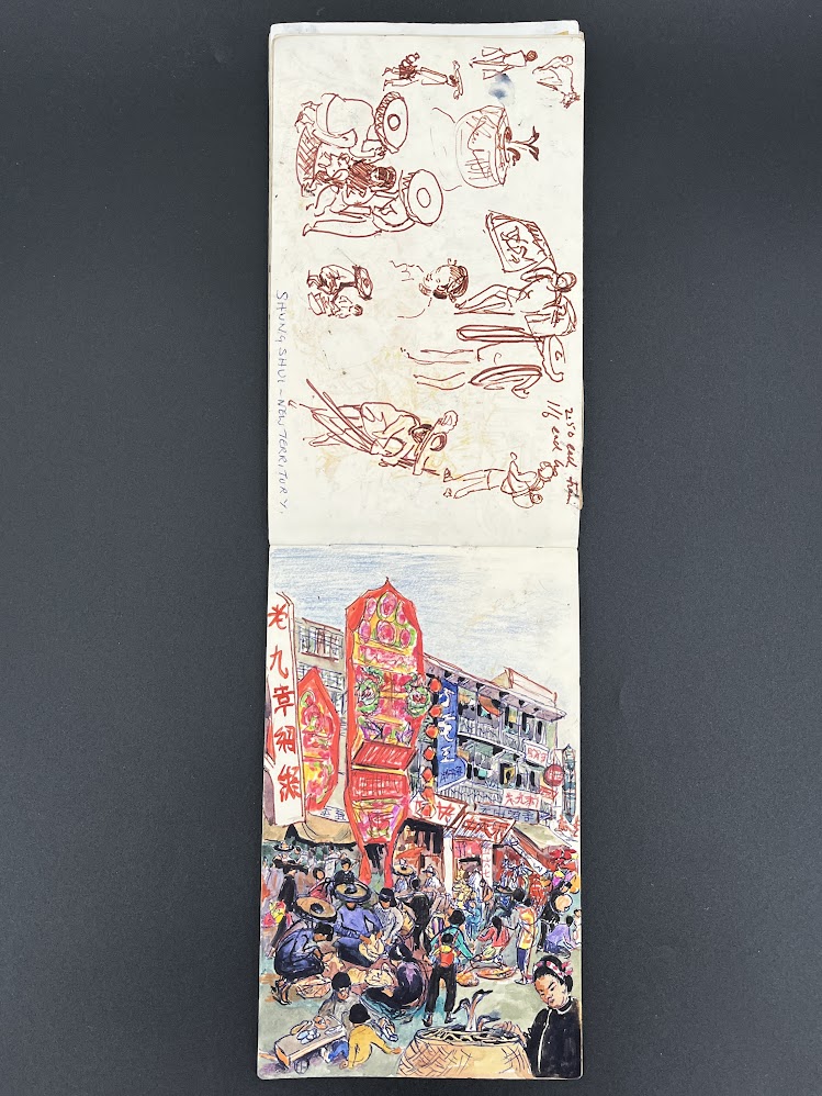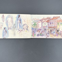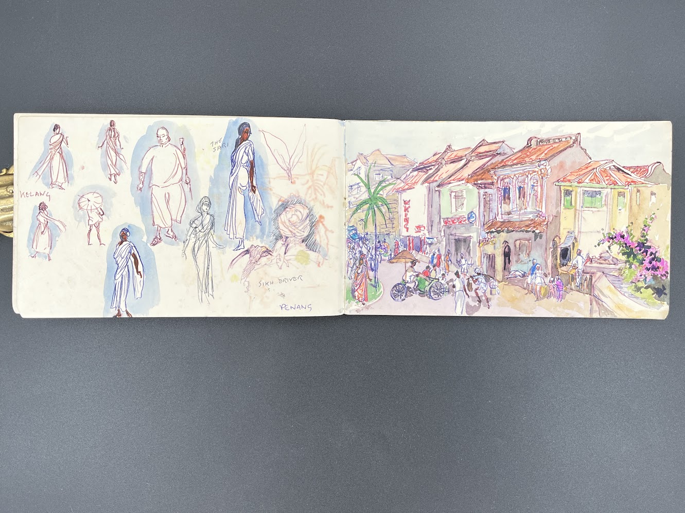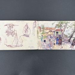 PHYSICAL DESCRIPTION: Soft back landscape sketchbook measuring approx. 5” x 8” decorated in Chinese letter print, probably 1970s. Contains c30 pp. full page colour sketches alongside c18 pp. leaves full of vignettes and sketches capturing the people and characters along the way. A couple of leaves detached from stubs. Watercolour and pen. In very good condition.