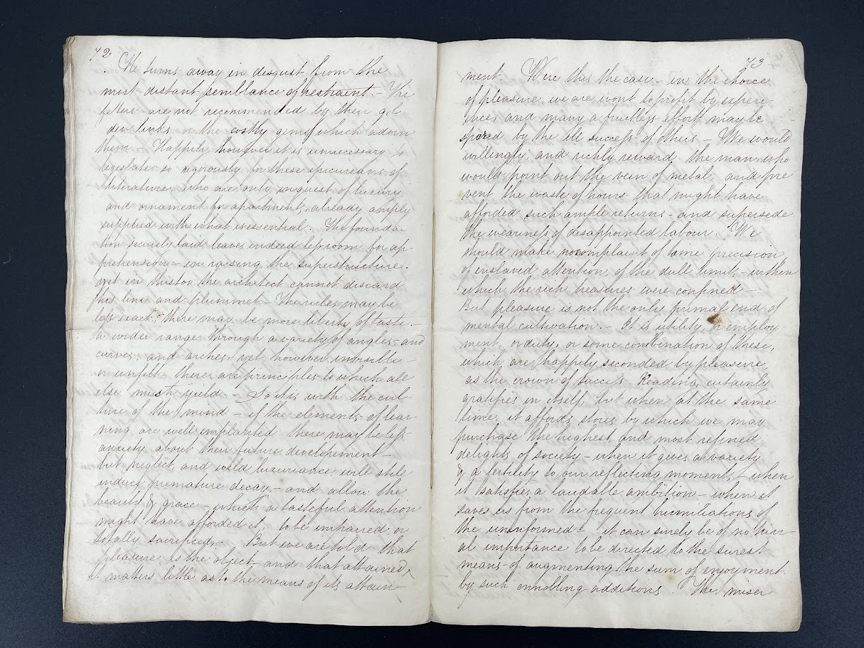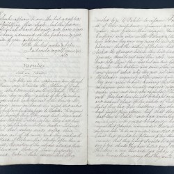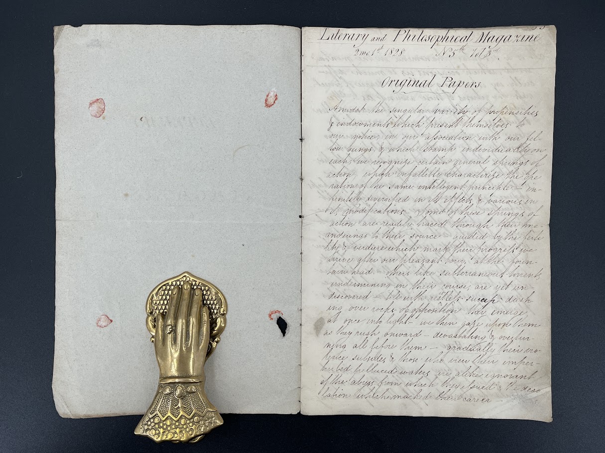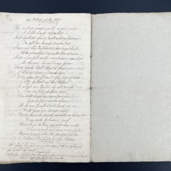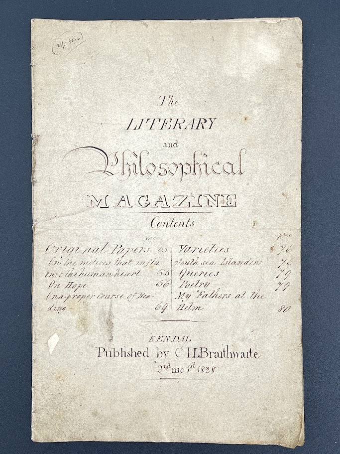 Manuscript literary magazine for coterie circulation by Charles Braithwaite with a powerful essay on the efficacy of reading by the prominent English Quaker minister (and mother of the editor) Anna Braithwaite. Written and edited by her son Charles Lloyd Braithwaite in his late teens in their native Kendal (modern-day Cumbria) his mother Anna’s essay develops a subtle argument about the moral power of well-chosen reading materials: ‘Reading, certainly gratifies in itself, but when at the same time if affords stores by which we may purchase the highest and most refined delights of society - which it gives a variety & a fertility to our reflections moment, & when it satisfies a laudable ambition... it can surely be of no little importance to be directed to the surest means of augmenting the sum of enjoyment by such ennobling additions.’ Of course Braithwaite also presents the opposite outcome as ‘Books are much degraded when considered as the mere panders of curiosity.’