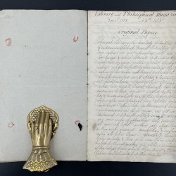 DESCRIPTION: Folio sized manuscript journal (19x29.5cm). Calligraphic manuscript title and contents list to buff thick paper wraps, dated ‘2nd Mo 1st 1828’ - February 1st 1828(?) and seemingly priced (top left) at an exorbitant 21 shillings. Sewn through spine fold; outer leaves very dusty. On the first leaf (p65) this issue is stated as ‘No 5 Vol 3rd’. Written in a single easily legible cursive hand, c2000 words in total; paginated pp65-80. The longest article is in the form of Anna Braithwaite’s long letter, signed ‘A.B.’ but written in her son’s hand.