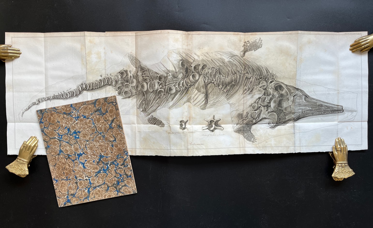 Anning, meanwhile, continued to make discoveries on the Dorset coast, and debate raged in scientific circles over the nature of these long-dead animals. By about 1818 a new specimen had come to light, almost certainly discovered by Anning, and far more complete than the earlier find. Now Home was able to state with confidence that this was an extinct lizard-like aquatic animal, which he named Proteosaurus, in his Philosophical Transactions papers of 1819, again illustrated with huge folding plates giving exquisite detail of the fossil. Writing to Anning's collaborator Henry De La Beche, Home stated that the specimen was 'one of the most extraordinary animals that inhabited the Antediluvian world.'