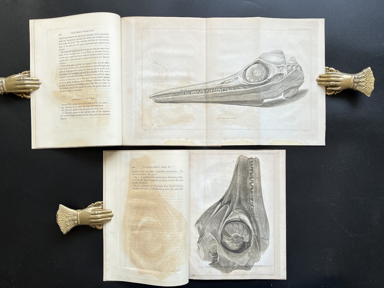 These two papers, by the anatomist Everard Home, comprise the first scientific description of ichthyosaurs. In the first paper (1814, four plates; two folding) Home describes Mary Anning's landmark discovery, remaining unsure if it is a fish or some other kind of creature; in the second (1819, three plates; one folding - the huge Proteosaurus image) Home concludes that what he calls 'Proteosaurus' is an extinct aquatic lizard. These are the two most important early publications relating to Anning's finds – papers that helped launch one of the great 19th century scientific careers.