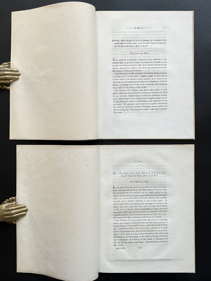 An Account of the Fossil Skeleton of the Proteo-saurus [and:] Reasons for giving the name Proteo-Saurus to the fossil skeleton which has been described. Philosophical Transactions, Vol. 109 (1819), pp. 219–216. Similarly bound to above, 3 plates with offsetting, similarly near fine condition and minor spotting - the fold-out Proteosaurus is the last of the plates.
