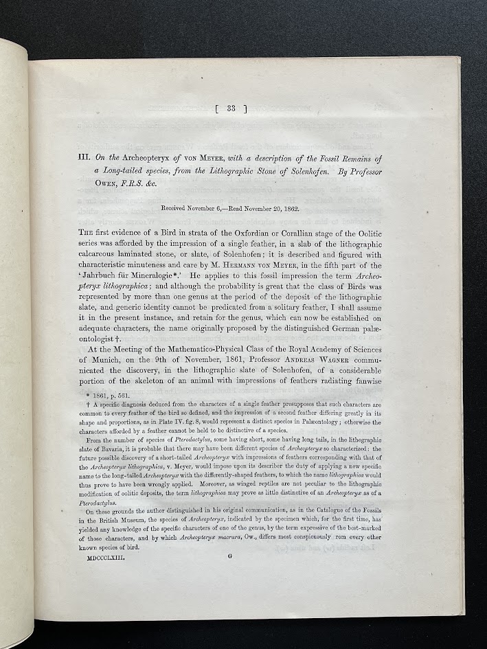The first published description of Archaeopteryx, one of the most significant fossils ever discovered. This is Richard Owen's classic Philosophical Transactions paper, illustrated with an exceptional lithographic folding plate showing a life-sized image of the type specimen.