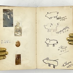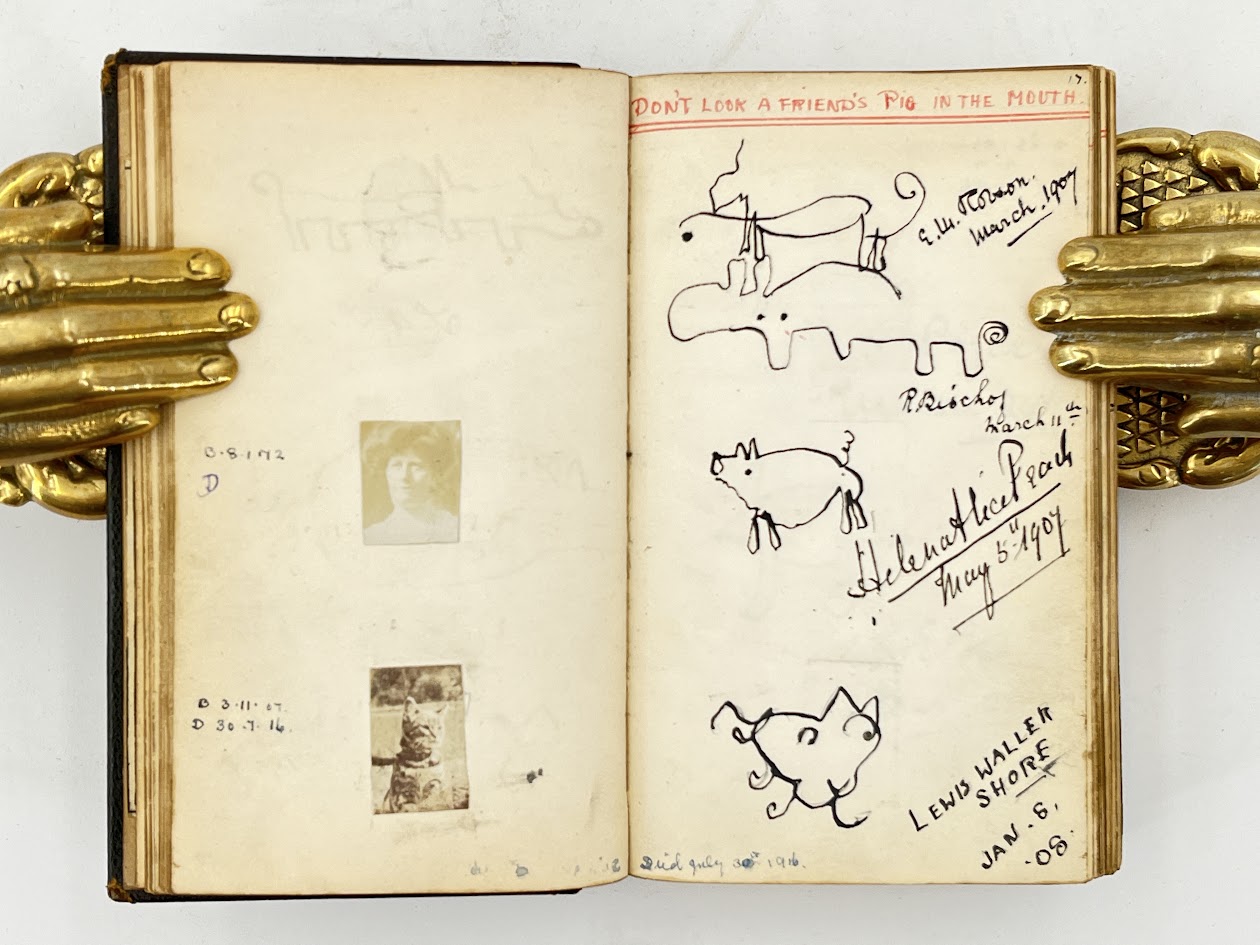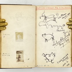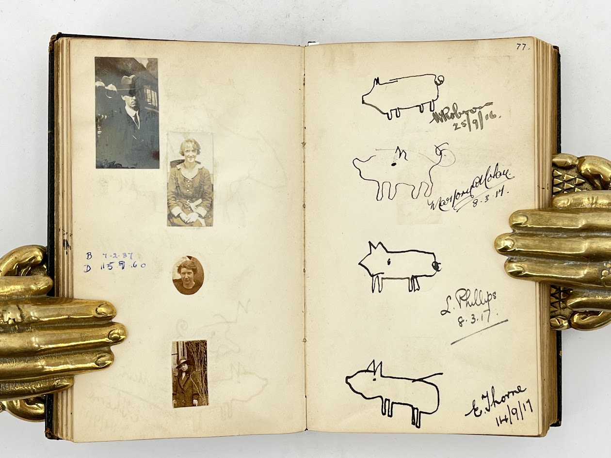 Edwardian parlour game manuscript containing 350 drawings of pigs which were made by friends and relatives while blindfolded. The creations of Ada Alice Shore who was born in 1890 and lived in West Kensington Park in London, she began inviting friends and relatives to contribute in January 1907 (a notable article from 1905 in the Strand Magazine featured various celebrities attempting to draw blindfold pigs) and the last of Shore’s pigs was drawn more than fifty years later. Shore abides by a series of rather rewarding conventions in this manuscript, recording details of her contributors, name, date of birth and sometimes death - sometimes during World War One as with ‘A Bodley’, ‘Killed in Action 10.[19]16’. She has also included tiny head shots taken from photographs, further illustrating the MS and added punning running titles to the early pages, sometimes Shakespearean in inspiration: ‘There is a destiny that shapes our pigs, rough-hew them how we will’ - ‘He was a Pig: take him for all in all, I shall not look upon his like again.’ A lovely object, redolent of its period.