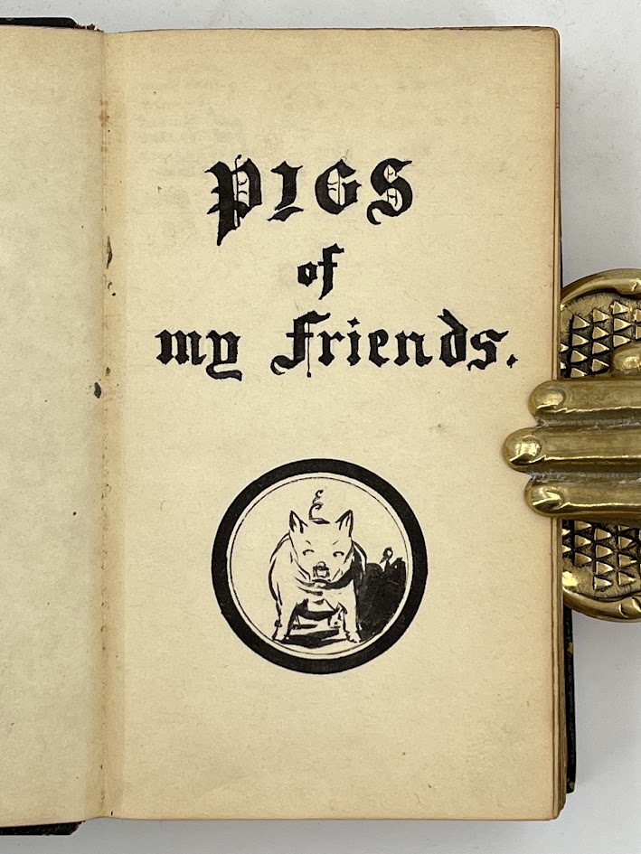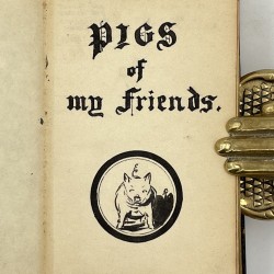 DESCRIPTION: Small manuscript bound in pebbled black roan, all edges gilt (14x8.5cm). Violet Ada Shore’s bookplate appears on the front pastedown; manuscript title page: ‘Pigs of my Friends’ with a pig vignette; page of family names and dates. The first page offers her parents’ effort, January 1907 - ‘Arthur M Shore’ and ‘Ada Alice Shore’ with their portraits opposite, entitled ‘Course of true pigs never did run smooth’ with pages for her siblings and grandparents to follow. Contributions from members of the Tweddle family, young men in uniform, T Campbell Pope. Her running titles become increasingly allusive and imaginative and the contributors various, continuing regularly through the following decade and more sporadically later in the manuscript.