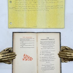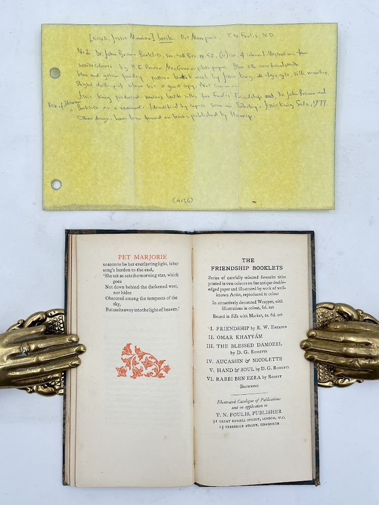 Rare book binding displaying Jessie M King’s blue and green paisley pattern batik silk. One of the most influential artists of her time, King (18… Read more