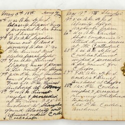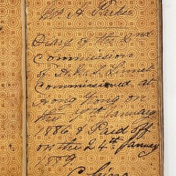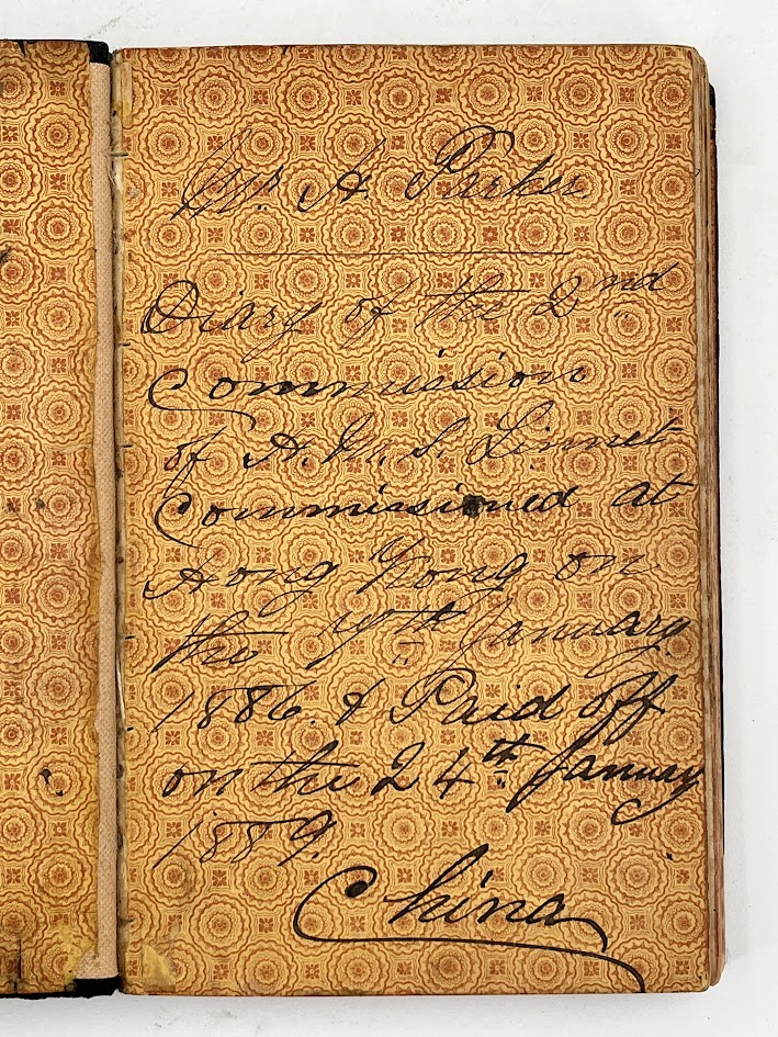 DESCRIPTION: Parker writes in a small octavo which is bound in black textured cloth over thin boards, spine relaid and robust; decorative printed endpapers. Ruled leaves with stapled gatherings. The manuscript runs to 118 unnumbered pages, 1886-1889, written in an easily legible hand using black ink plus blanks with a manuscript title page on the patterned first flyleaf: W H Parker Diary of the 2nd Commission of H.M.S. Linnet Commissioned at Hong Kong the 7th January 1886 and Paid off on the 24th January 1889. China.’