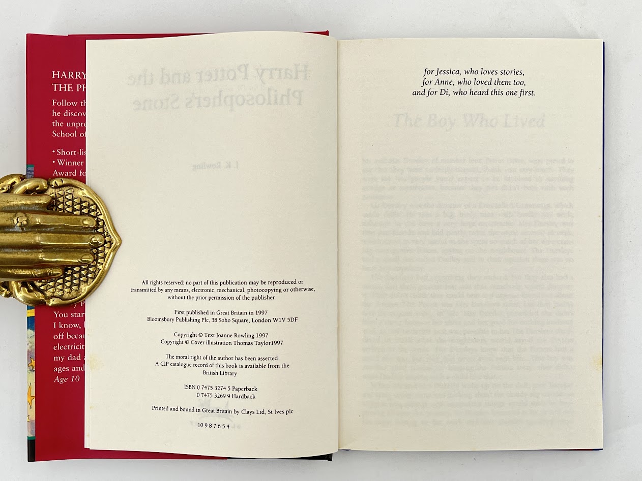 Fine fourth impression of the Bloomsbury true first edition of the first Harry Potter novel. Number line: ‘10 9 8 7 6 5 4’; no gap between ‘Thoma… Read more