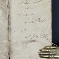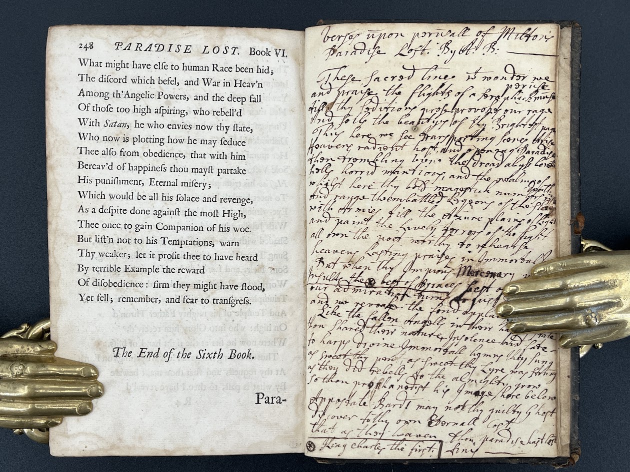 To add to the book’s interest, on the penultimate flyleaf, but written in a slightly earlier hand, is a copy of Thomas Yalden’s ‘Verses upon perusall of Milton’s Paradise Lost by A.B.’ (first published 1698 as ‘On the re-printing Milton’s Prose Works with his Poems. Written in his Paradise Lost.’) Yalden was a friend and Magdalen College, Oxford contemporary of Addison, but the writer of our version of this poem appears to be drawing upon a different source from the printed one, and indeed to attribute it to another author.