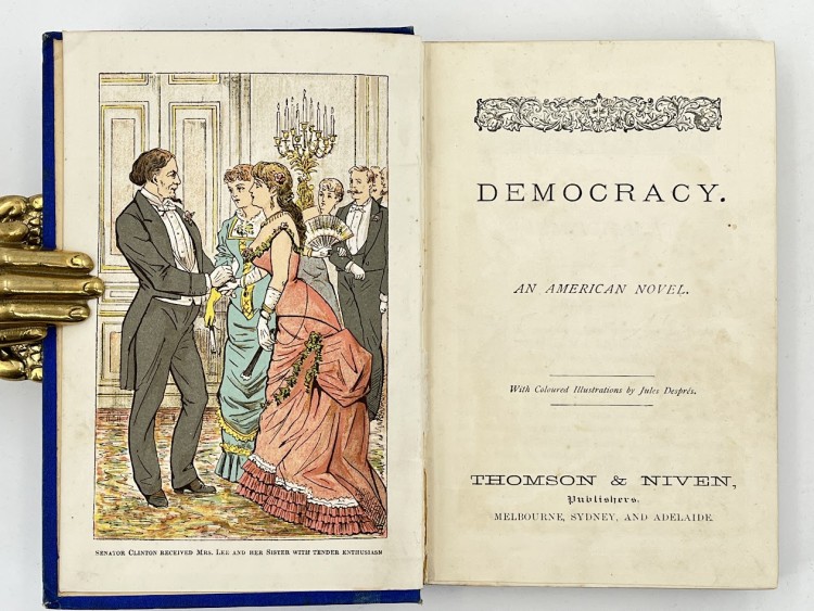 Seemingly unlocated in any institutional collection, an illustrated Australian edition of Brooks Adams’ satirical novel about the acquisition, use and abuse of political power, set in Washington D.C. Published anonymously in 1880 we date this edition to the 1880s, with its stylish illustrations by the French artist, Jules Despres. DESCRIPTION: Bright blue cloth with black and gilt decoration and bevel edges. All edges gilt. Frontispiece and 5 plates, pp272. Colophon note: ‘Printed by Walter Scot…… Read more