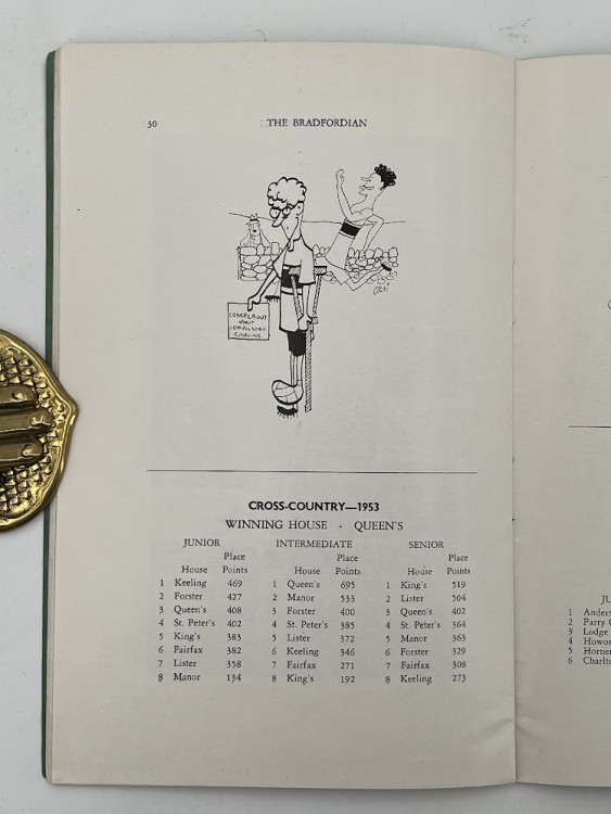 Two of the artist’s earliest self-portraits, created while he studied at the school and published here in the school magazine, The Bradfordian. Hockney’s cartoon-style self-portraits appear in the March 1953 issue (235), both signed in print ‘Okni’ and depict the young David protesting ‘about Compulsory Running’; in the second image opposite he is seen being pushed by another boy in a bath chair alongside a dry stone wall. Very good condition, bound in printed green card wrappers; one torn corne…… Read more
