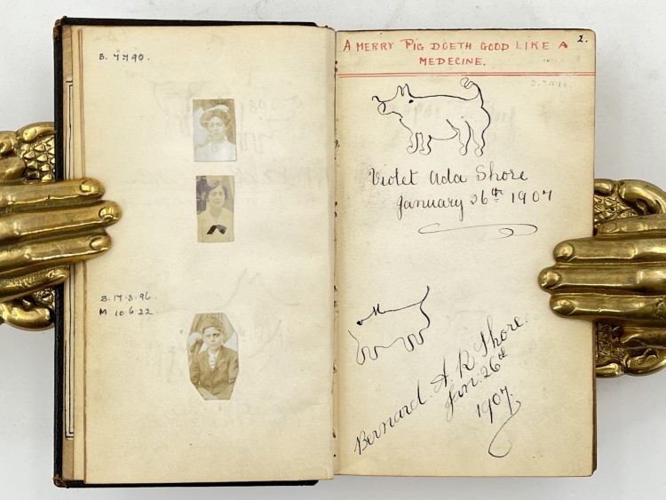 Edwardian parlour game manuscript containing 350 drawings of pigs which were made by friends and relatives while blindfolded. The creations of Ada Alice Shore who was born in 1890 and lived in West Kensington Park in London, she began inviting friends and relatives to contribute in January 1907 (a notable article from 1905 in the Strand Magazine featured various celebrities attempting to draw blindfold pigs) and the last of Shore’s pigs was drawn more than fifty years later. Shore abides by a se…… Read more