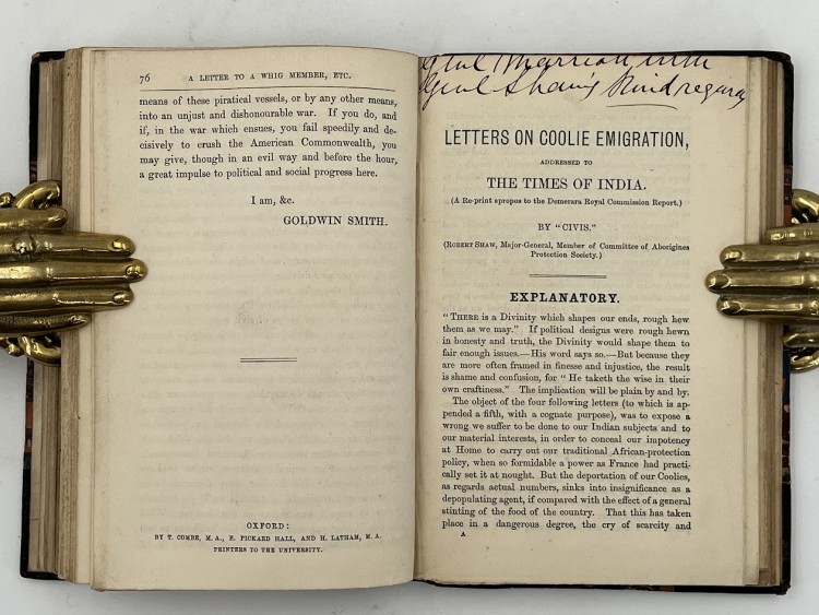 Two unrecorded anti-slavery pamphlets addressing the forced migration of labourers from the Polynesian islands and of so-called ‘coolie emigration’ from ‘French West Indian and South American possessions’ to British India. These otherwise unknown texts have been bound alongside two classic British pamphleteering texts attacking American slavery, during the Civil War, five other imprints and a long autograph poem which was written in response to a challenge by ‘some malicious belles’. The two tex…… Read more