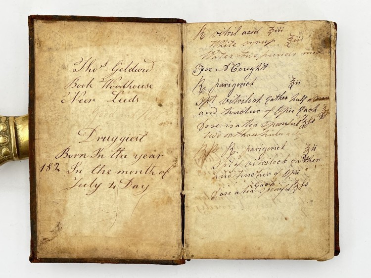 Four rare imprints containing receipts and recipes for wine, foodstuffs and medicines, owned and annotated by ‘Tho[ma]s Geldard... Neer Leeds Druggist Born in the year 182[?] In the month of July 4 Day’. As well as inscribing the book with his personal details Geldard, who places himself in the ‘Woodhouse’ area of Leeds (just by the present day university campus), has added in manuscript a few examples of his own medicines, notably a popular tincture of opium, paregoric: ‘For a Cough/ R. parigor…… Read more