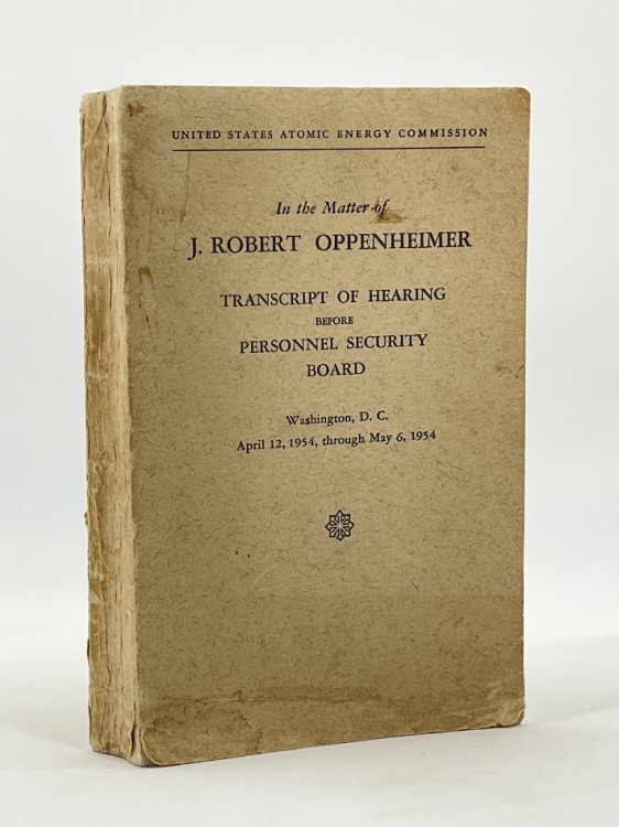 First edition of the 1954 security hearing held by the U.S. Atomic Energy Commission that revoked the clearance of the ‘father of the atomic bomb’, Robert Oppenheimer. Over four weeks, it investigated his loyalty, past left-wing associations, and opposition to the hydrogen bomb, marking a peak of Cold War-era anti-communist McCarthyism. These proceedings form the basis for the climax of Christopher Nolan’s 2023 biographical portrayal of Oppenheimer’s life, starring Cillian Murphy. This first edi…… Read more