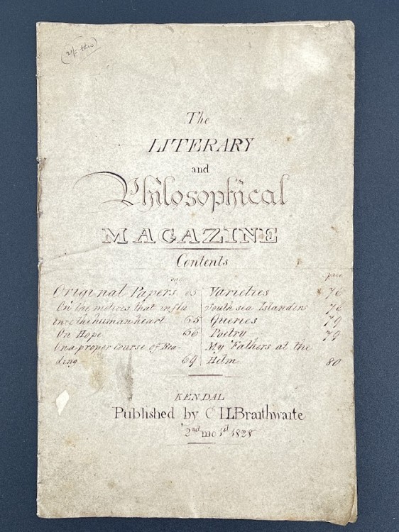 Manuscript literary magazine for coterie circulation by Charles Braithwaite with a powerful essay on the efficacy of reading by the prominent English Quaker minister (and mother of the editor) Anna Braithwaite. Written and edited by her son Charles Lloyd Braithwaite in his late teens in their native Kendal (modern-day Cumbria) his mother Anna’s essay develops a subtle argument about the moral power of well-chosen reading materials: ‘Reading, certainly gratifies in itself, but when at the same ti…… Read more