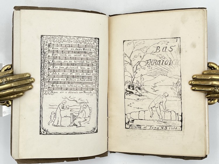 Strikingly beautiful William Blake-inspired, fully lithographed edition printed at the Iona Press by the Gaelic scholar John McCormick and William Muir. The press which was founded in 1887 had a mission to preserve and promote Iona's history and Muir himself had recently spent time creating lithographed editions of Blake’s work in London and his influence is unmistakable in this work. DESCRIPTION Stiff brown paper printed wrappers with yapp edges; rubbed and a little faded; stab sewn with yellow…… Read more